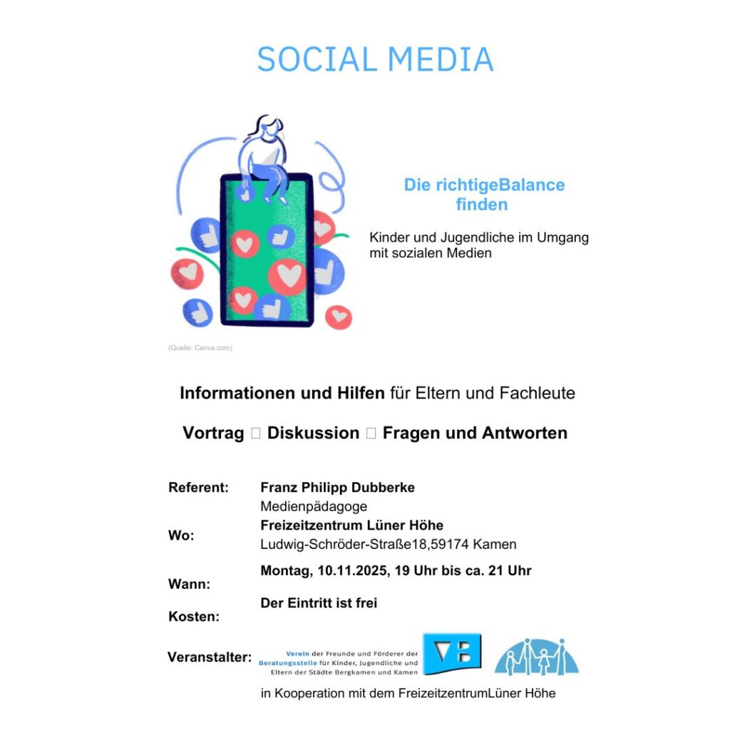 Zum Thema „Social Media“, bietet der Verein der Freunde und Förderer der Beratungsstelle für Kinder, Jugendliche und Eltern der Städte Bergkamen und Kamen in Kooperation mit dem Freizeitzentrum Lüner Höhe diese Veranstaltung am 10.11.2025 um 19:00 Uhr an.